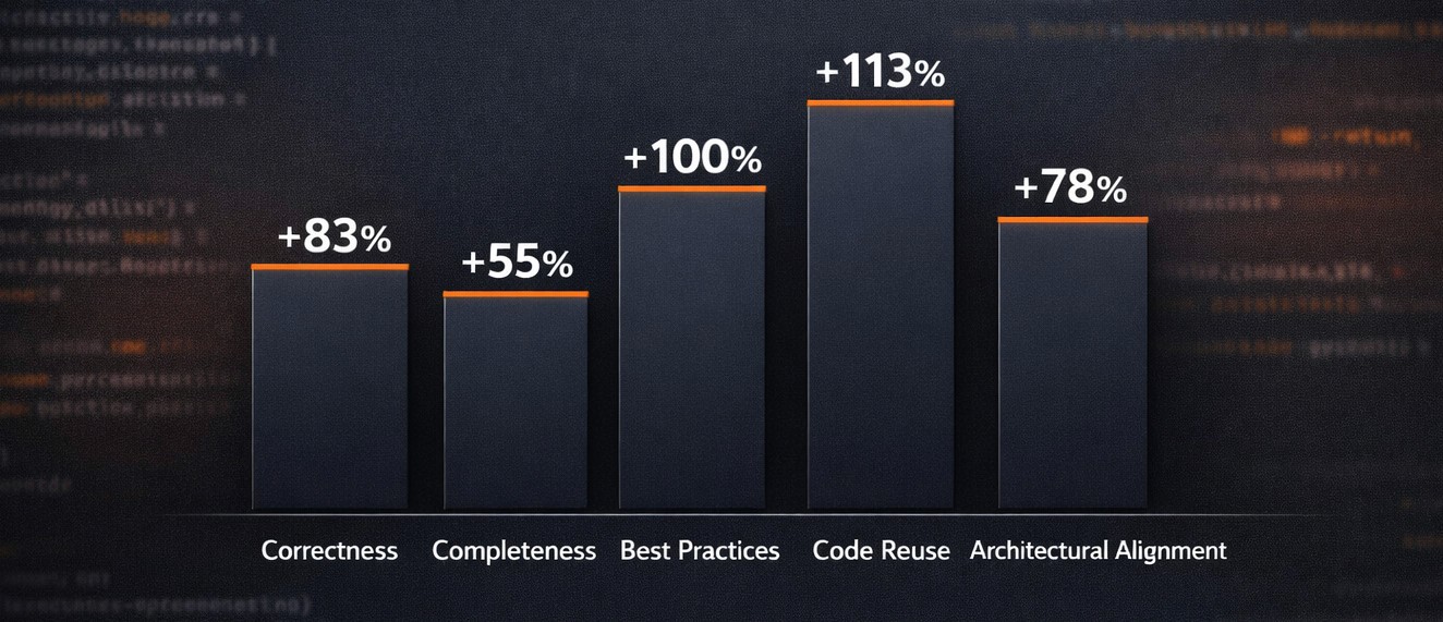 Best Practices (+100%) evaluates whether the code follows established quality patterns: proper error handling, clean architecture, appropriate abstractions. With context, the agent knows what "good" looks like in your specific codebase, not just in general.